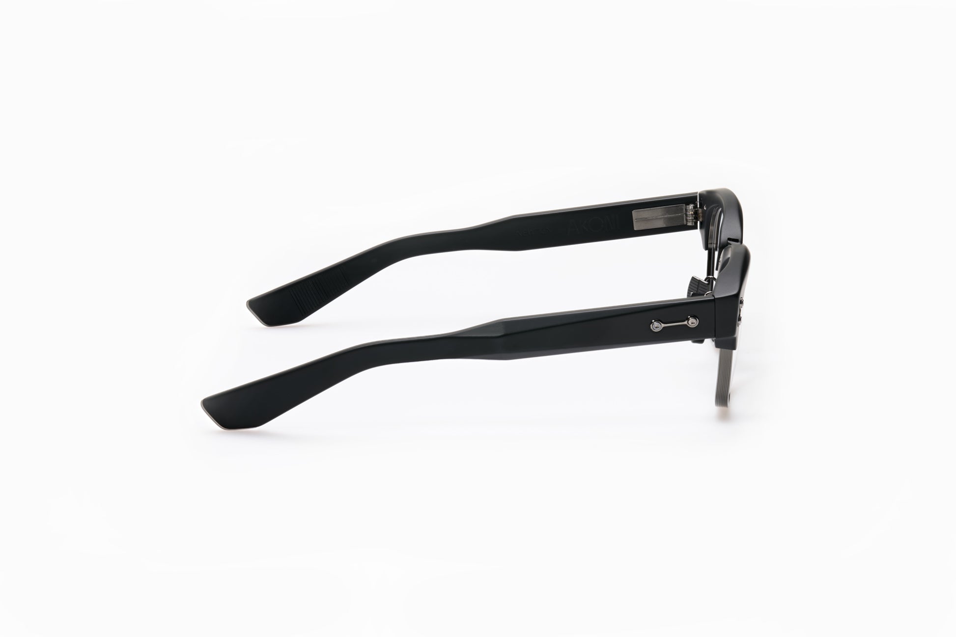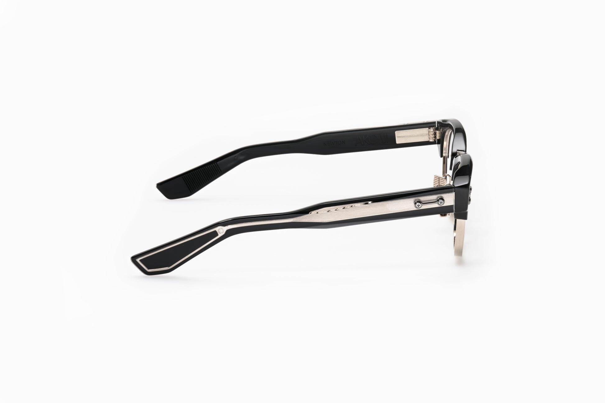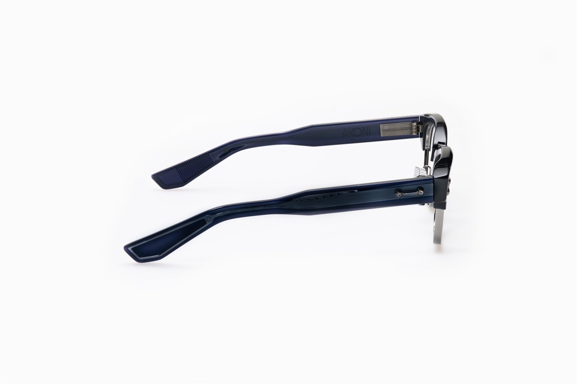 The Newton frame from Collection VIII is a compelling reinterpretation of the iconic optical Clubmaster shape, designed to make a lasting impression. This unisex frame combines classic sophistication with a masculine twist, making it an essential piece within any eyewear collection. The design features a striking contrast between the thick, edgy acetate temples and the robust titanium eye rim, which is notably thicker than typical designs. This substantial titanium is enhanced by knurled pressed lines, a detail echoed in the acetate temple cores, adding a layer of texture and refinement. The Newton frame’s bold aesthetic is further defined by its prominent acetate eyebrow and temples, offering a modern touch while maintaining a strong appeal. The nose bridge features two parallel titanium elements, a nod to Akoni Copernico design, emphasizing its iconic status. Additionally, the laminated temples with a skeleton metal core provide enhanced structural integrity and perimeter, ensuring both durability and a striking visual impact.