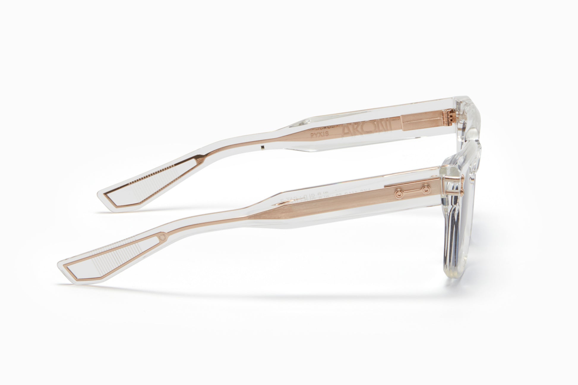 Shimmering brightly through southern hemisphere nights, the Pyxis constellation was named for the mariners’ compasses that have guided brave seamen since the days of the most ancient of Greek myths. Inspired by the audaciousness of those fabled explorers, Akoni’s Pyxis also aims to push past known frontiers and discover new territories. The substantial design builds upon the familiar masculine silhouette of the classic wellington frames, which were a popular choice for postwar cinema’s greatest leading men . But, never one for opting for the expected routes, Akoni’s design team navigates new trails , adding a host of impressive new elements, including eye-catching visible titanium cores, expertly positioned to float within laminated Japanese acetate temples.