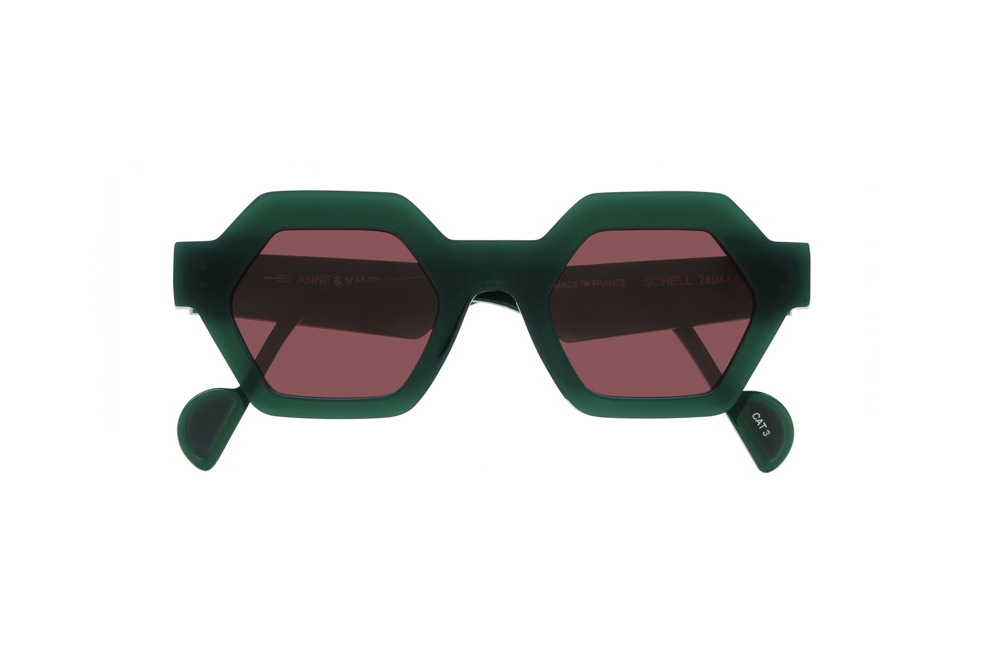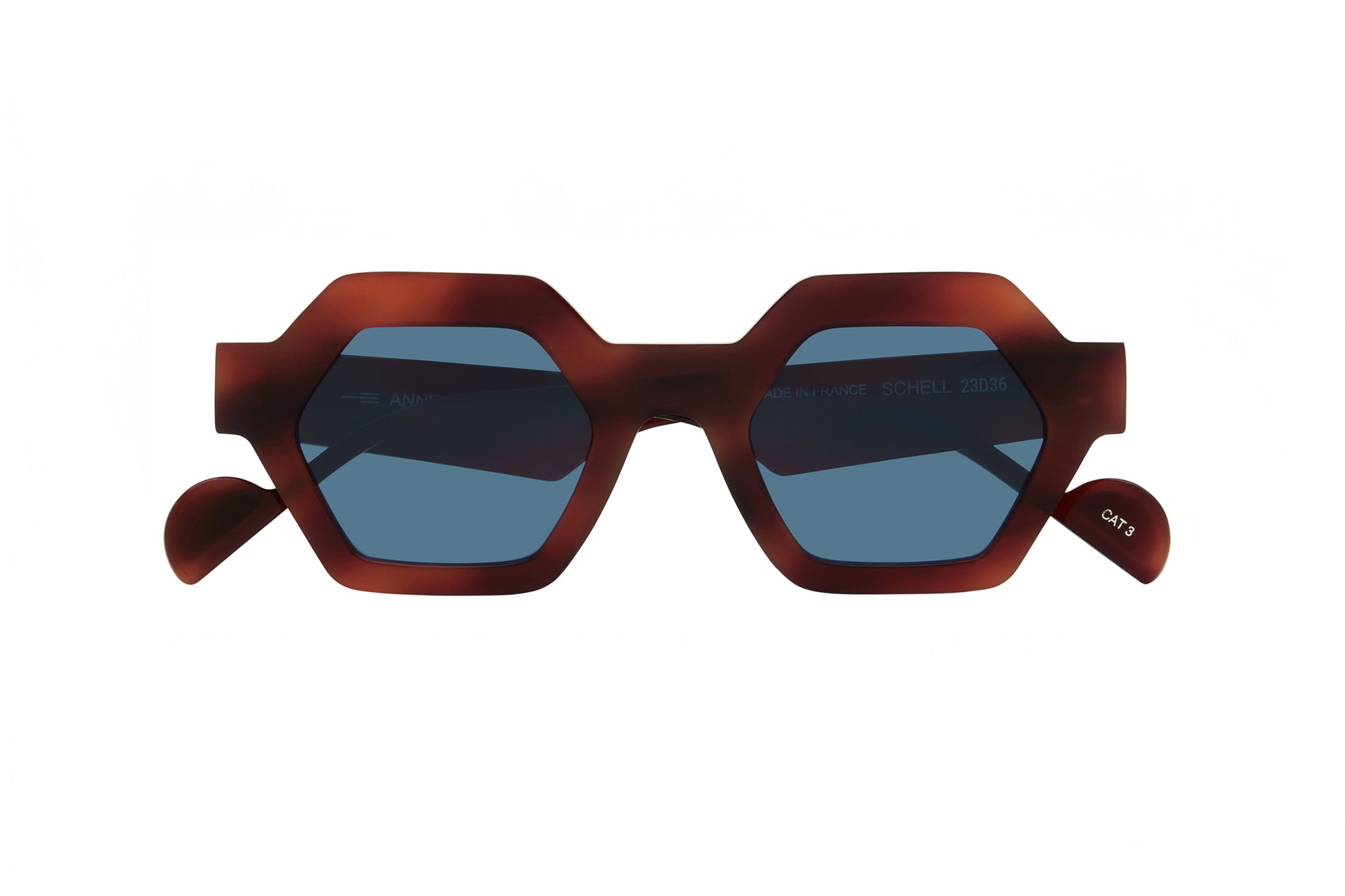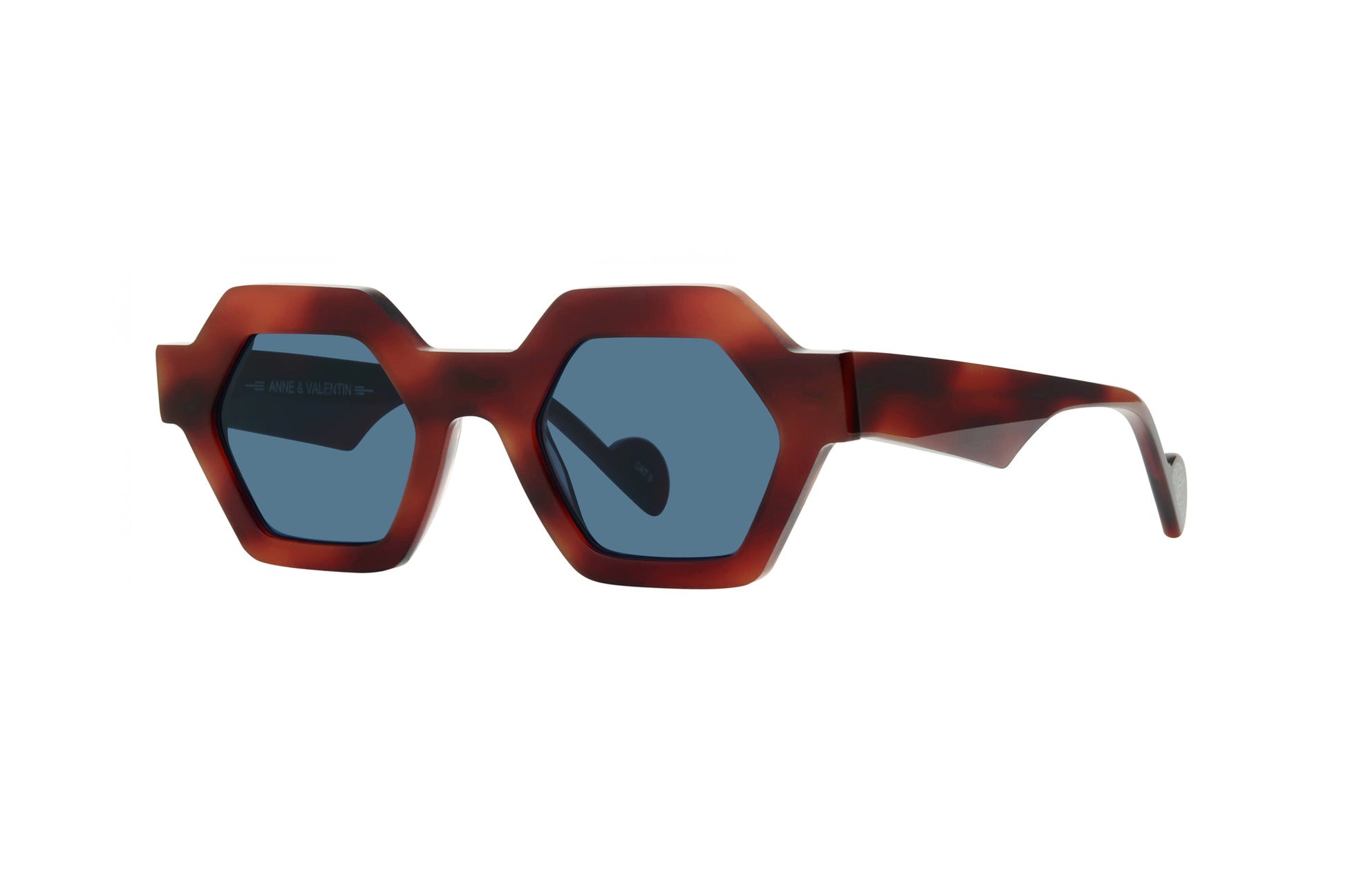 SCHELL. A small hexagonal frame with aligned bridges and hinges. Graphic and almost diagrammatic. Architecturally structured, like a “stop” sign you’re tempted to run. Casual yet composed. Dripping with Anne & Valentin’s signature DNA. Tense without being uptight. Arty. Used to be shy. Used to. Effortlessly cool, liberated, with a smile that says “I know better now…” Easy life, easy vibes.