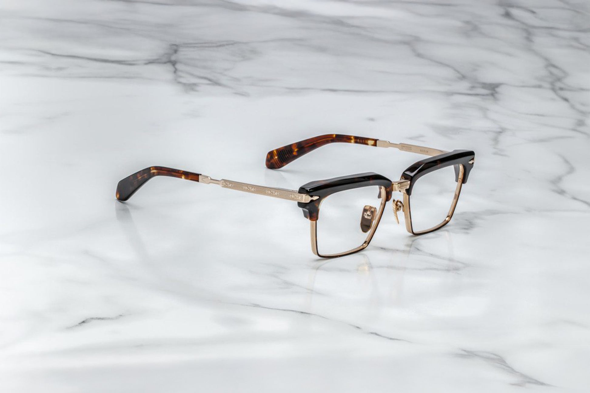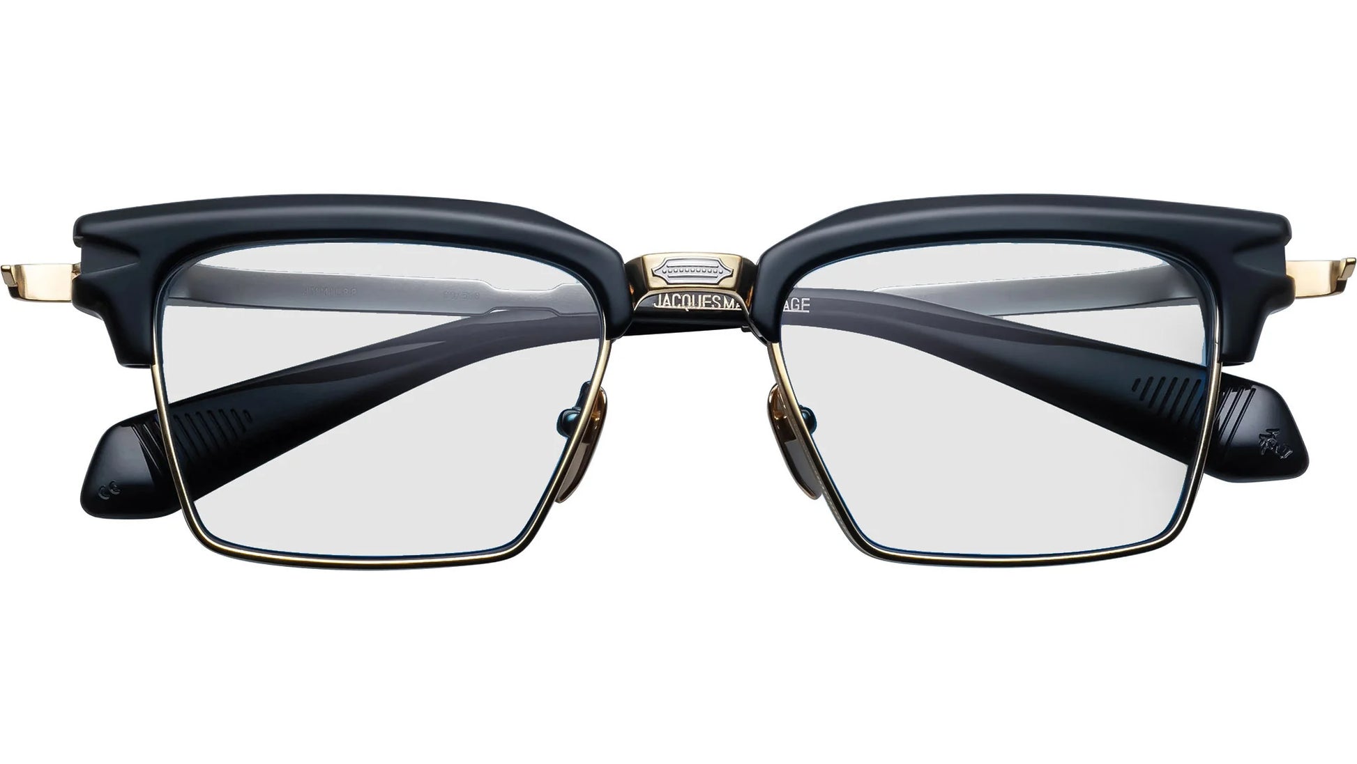 Classic '50s-inspired combo spectacles with prominent acetate brow, square titanium lens shape, our signature arrowhead monoblock hinge, and finely engraved temples with a unique arrowhead motif. A serious and sophisticated spectacle of the highest caliber, these classic ‘50s-inspired spectacles are a stoic combination of craft and ambition, featuring a prominent acetate brow with a sleek titanium lens rim, and finely engraved temples with a unique arrowhead transition.