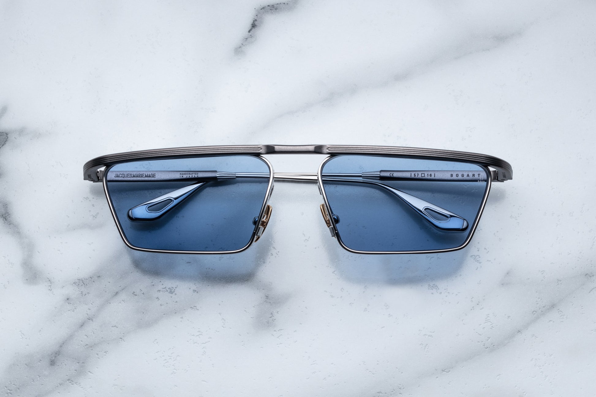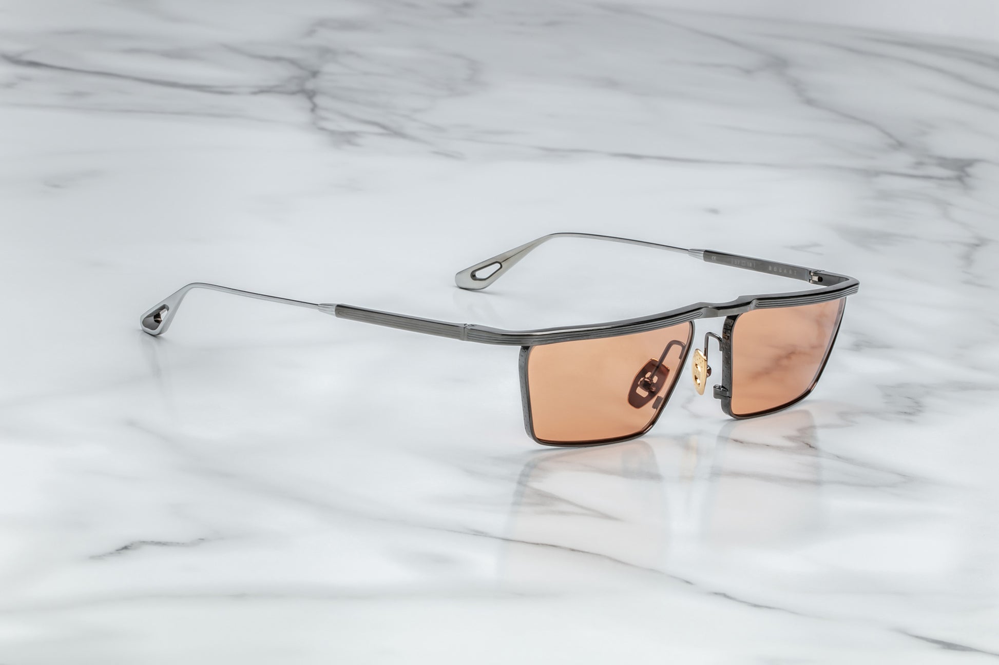 Late-'50s-inspired titanium spectacles with trapezoid lens shape, featuring prominent brow bar, perforated eyeshields, and temple tips with dual-tone eyelets. Set the picture in motion with these '50s-inspired box-office attractions that are guaranteed to be a critical and commercial hit. Take a chance on the role of a lifetime and your performance in these classic Hollywood heartthrobs might just make you a cultural icon.