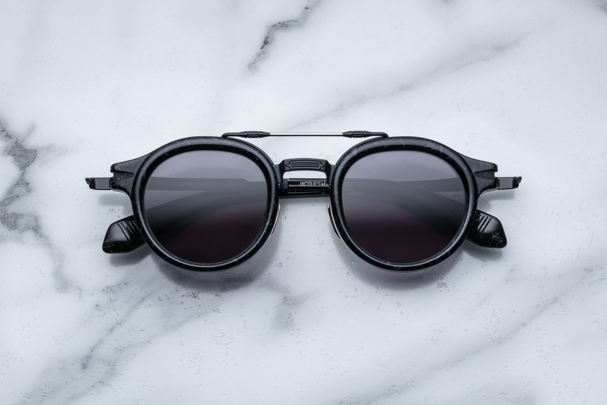 Circular '50s-inspired combo spectacles with heavy acetate lens shape, distinct titanium brow bar, our signature arrowhead monoblock hinge, and finely engraved temples with unique arrowhead motif. The fluid lines and fine embellishments of Art Deco find their full realization in these ‘50s-inspired spectacles made for the modern city, a bold acetate frame with a distinct titanium brow bar that speaks to these self-assured spectacle’s subtle old-world sensibility.