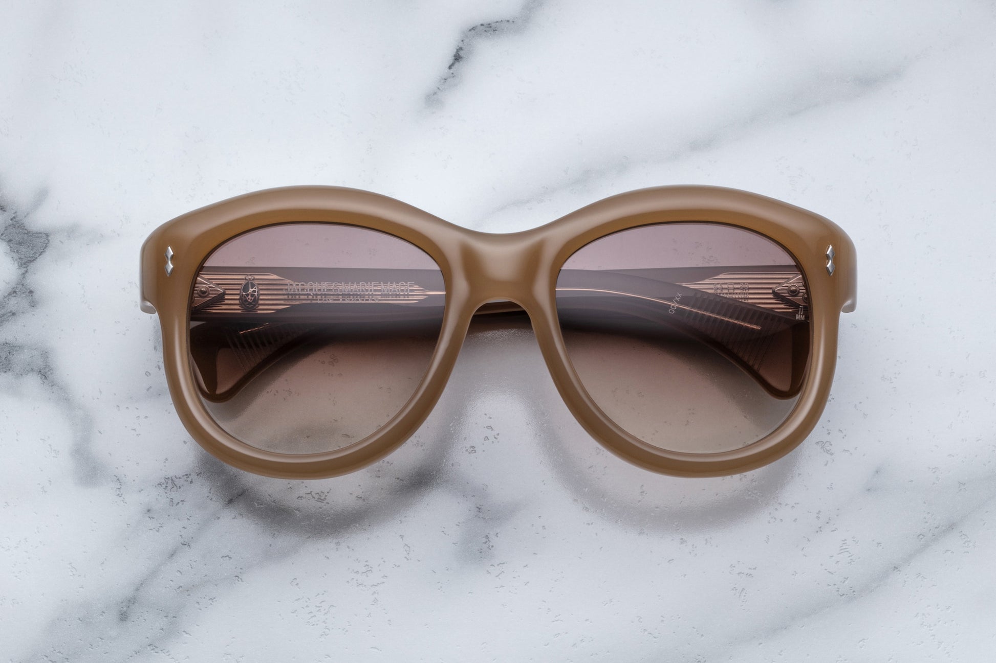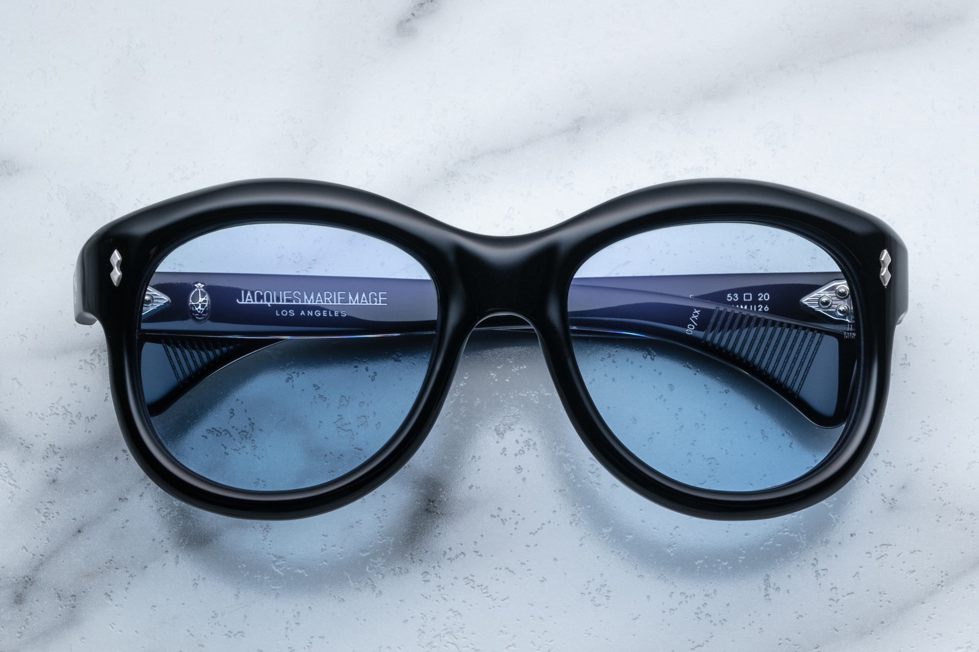 Oversized, ‘80s-inspired, Panto-shaped Jacques Marie Mage glasses handcrafted in Italy, featuring soft lines and our signature double-arrowhead front pins. Socialize with the socialites in this timeless expression of tasteful glamor, sensual spectacles handcrafted in Italy featuring the arched brows, soft curves, and sumptuous precious metal details required to strut your stuff with subtle supermodel mystique.