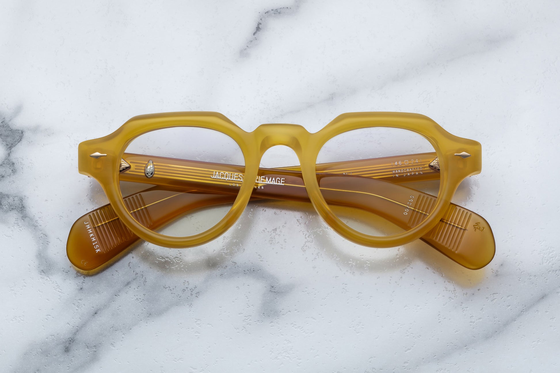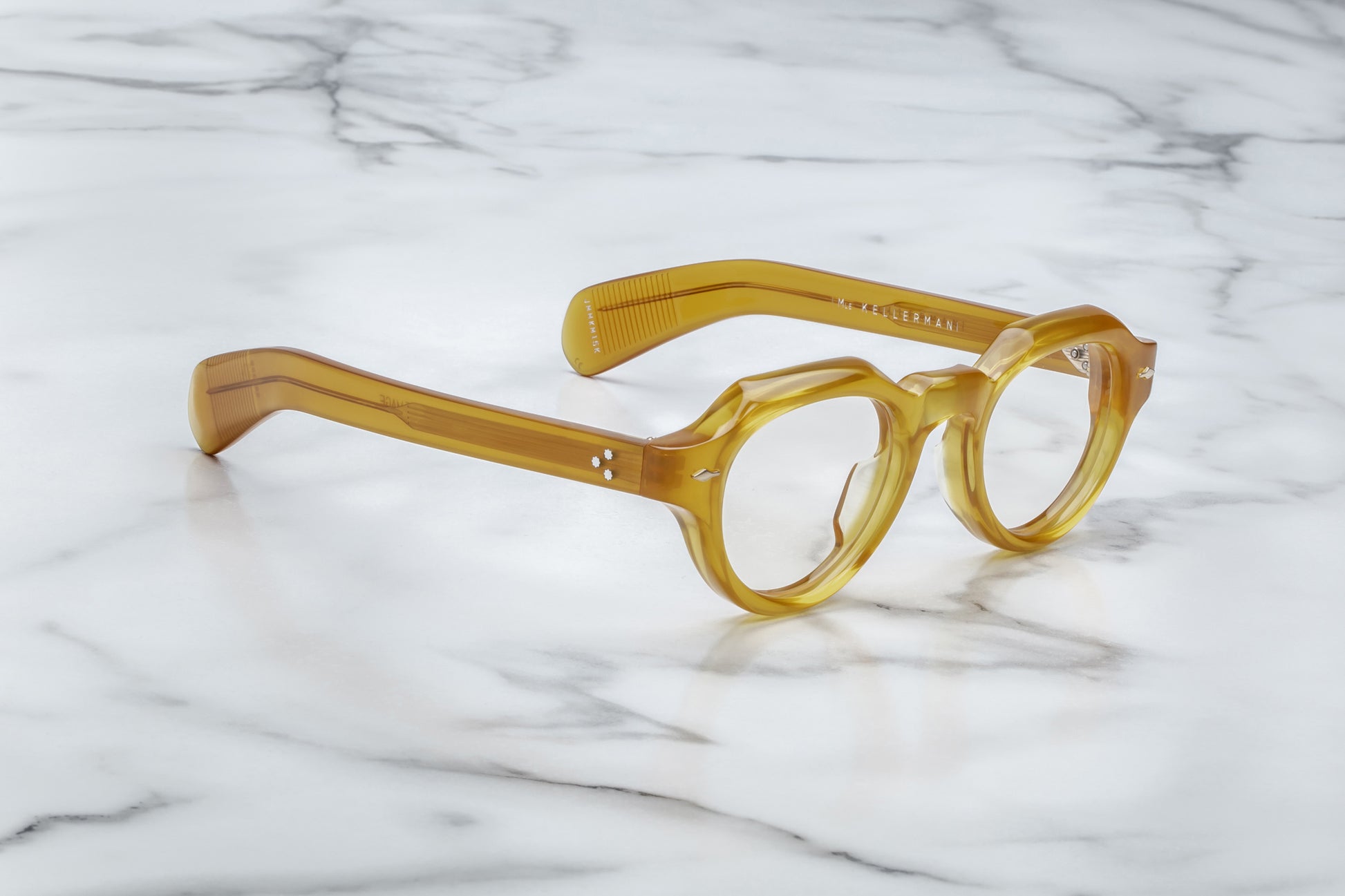 Sculptural, limited-edition glasses with modified Panto-shape, featuring signature precious metal arrowhead front pins, spur-shaped rivets, and custom 7-barrel hinges. With steady hand and unerring gaze, accept these spectacles as your guide. Named for famed French cavalry general François Étienne de Kellerman, they are daringly designed and skillfully sculpted with precision and poise, as rich with character as your own resume of achievement and resilience.