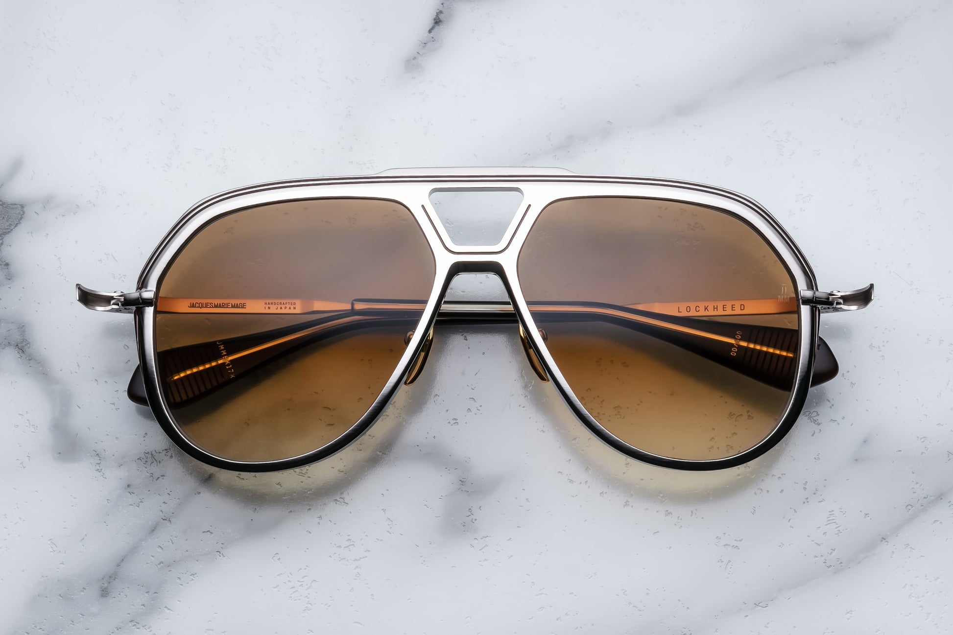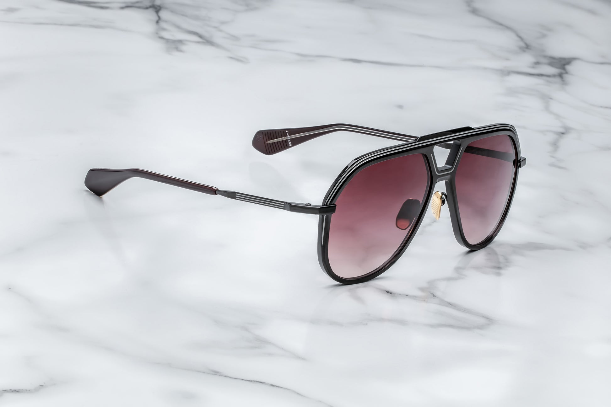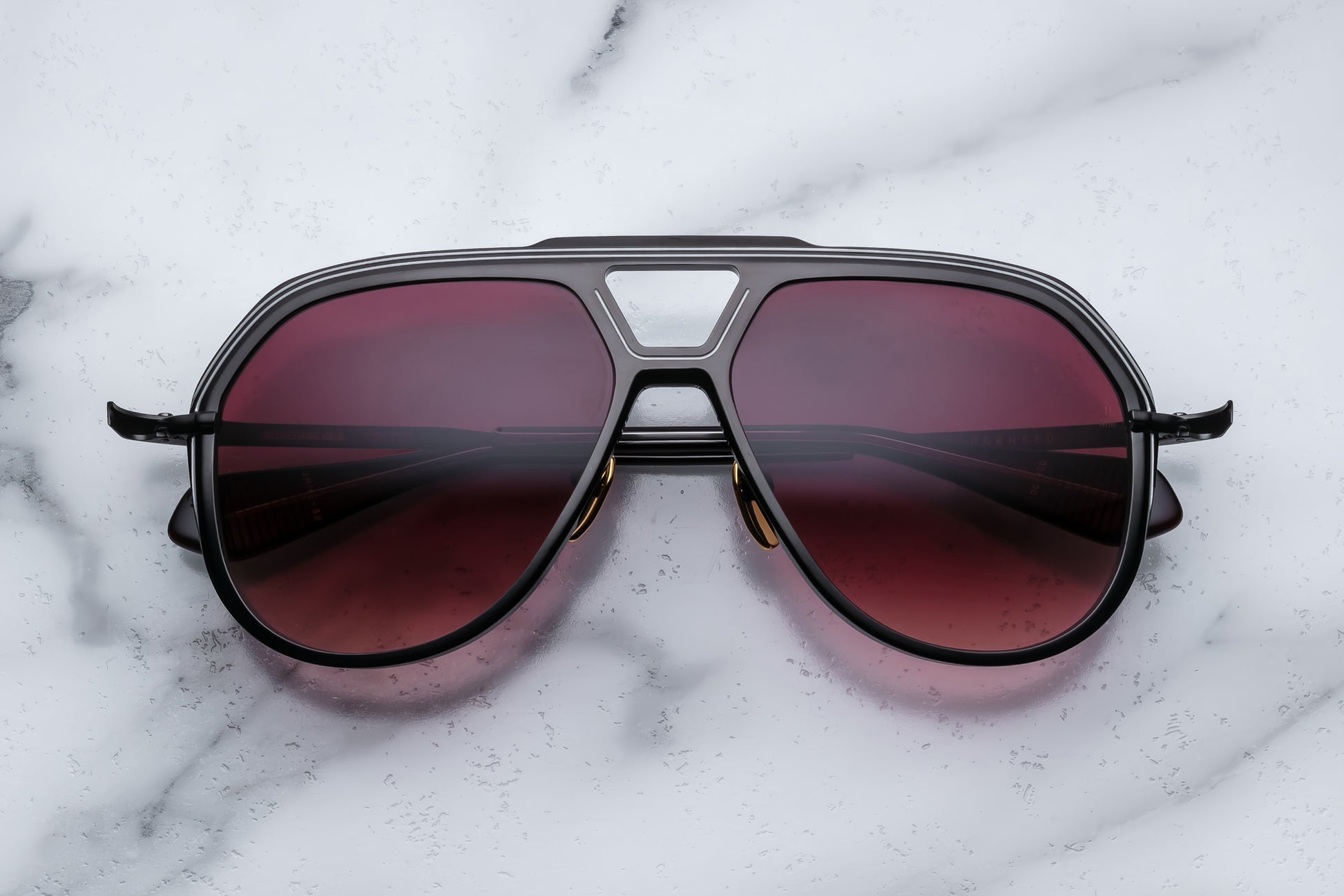 Classic, late-‘70s-inspired aviators in titanium with sculptural acetate temple tips, featuring a V-shaped profile, distinctive double-bridge and temples with dual-tone embellishments and hairline epoxy details. Wearing worldly limited-edition aviators handcrafted in Japan utilizing 100% beta titanium is the only way to fly, a streamlined affair designed with refinement and relevance, representing the epitome of executive elegance.