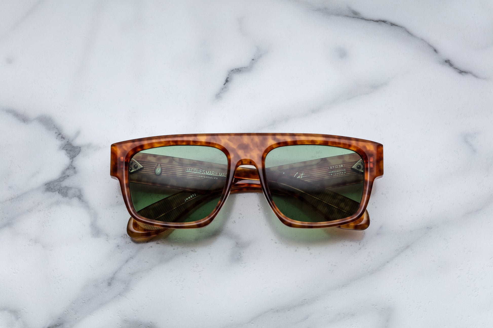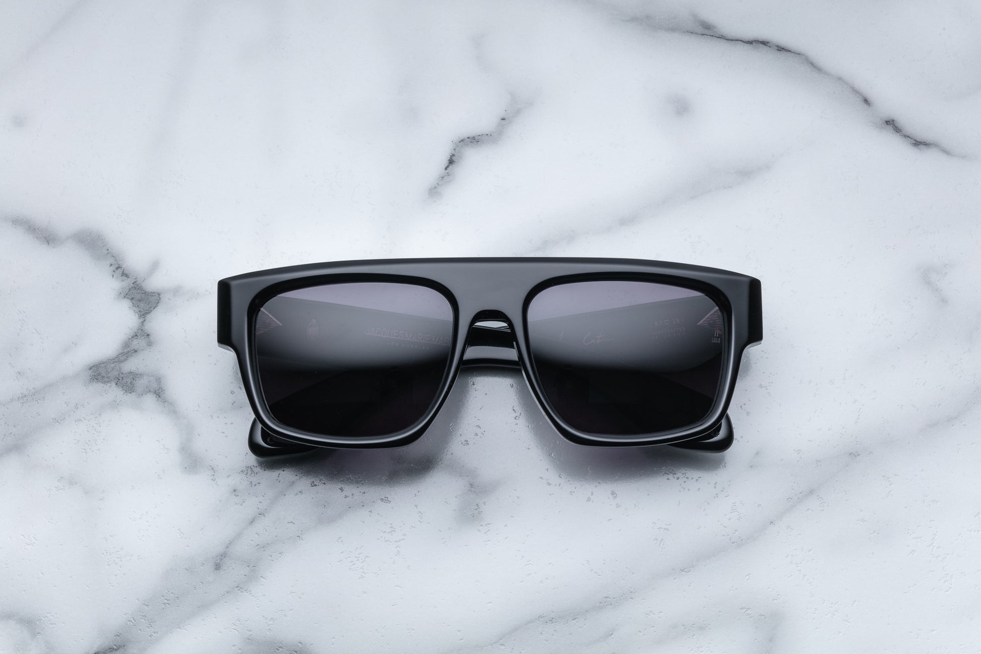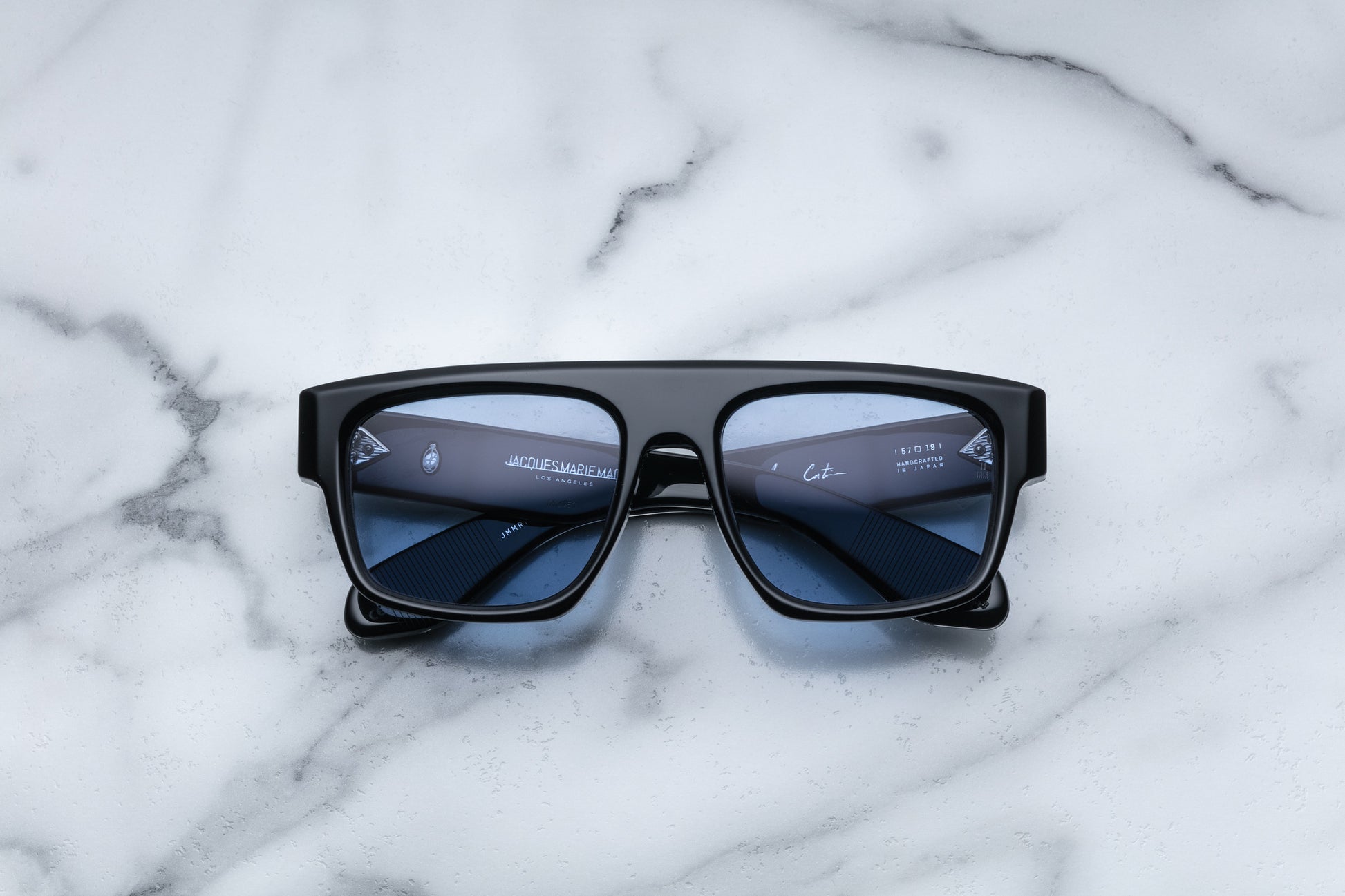 Bold expressions from GEORGE CORTINA FOR JACQUES MARIE MAGE, featuring distinctive browline, sculptural temples, and signature precious metal embellishments. No ordinary symbols of high society, these bold limited-edition spectacles are tough as nails and tender as the night, sculptural expressions with a serious stare and simmering charisma. An auspicious fit for feeling like a million-dollar trouper. Super-duper.