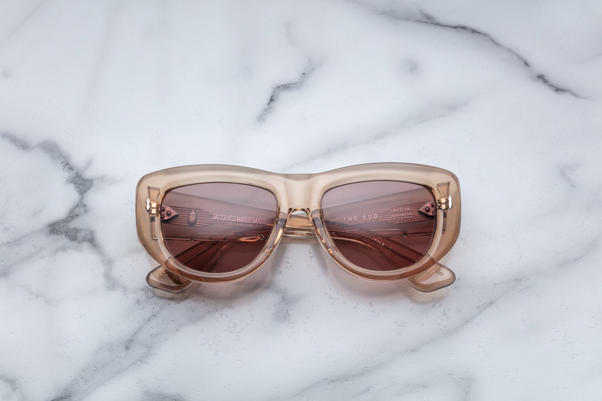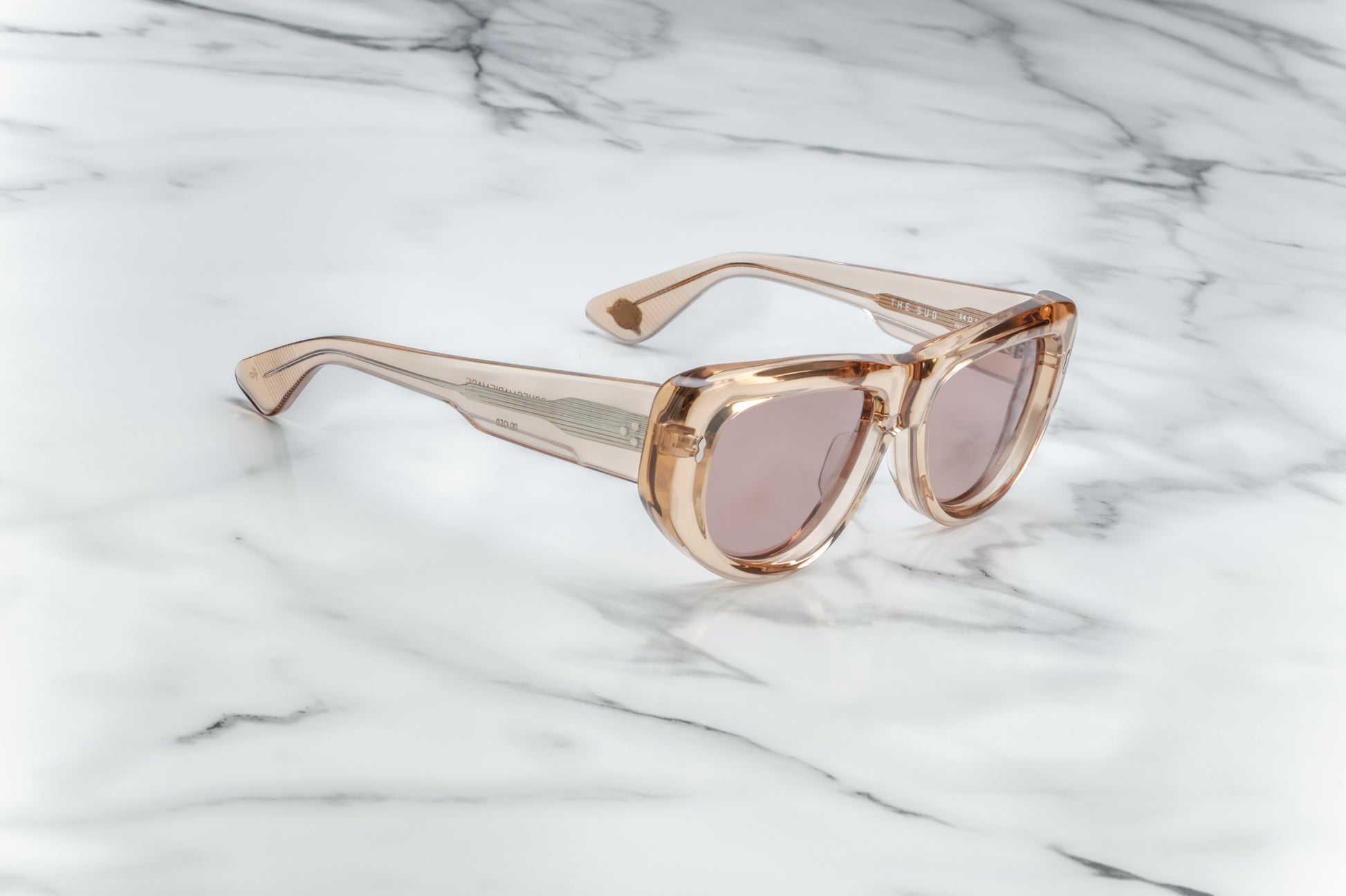 Classic, softly sloped & sculptural tourers with signature metal embellishments, including double-arrowhead front pins, spur-shaped rivets, ‘Cantilever' wirecores with hairline details, and temple-tips with a crest of Marseille. A timeless tourer from the ERIN WASSON FOR JMM collection available in "Simone," a Clear Sand color concept named after French philosopher, author, and activist Simone de Beauvoir. The softly sloped and sculptural frame is complimented by lenses in Bronze and our signature metal embellishments in Silver, including double-arrowhead front.